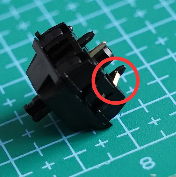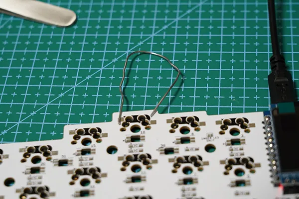 キースイッチを垂直にはめなかったせいで上手く刺さらずに折れ曲がっていました。これを 4 箇所くらいでしてしまったので自分の不器用さにちょっと凹みました。柔らかいので曲がってもピンセットや指で直せます。何回も曲げてしまうと折れてしまいそうな感じはあります。