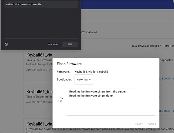 ファームの書き込みはRemapさん。ここ地味に詰まりました。参考程度に画像を貼っておくと、 keyball のファームを書き込む際に chrome だと画像のような黒いダイアログが出ます。この時にキーボードのリセットボタンを押し、黒枠の中の選択肢から ProMicro っぽい名前が一度選択肢から消え、また出てきたら接続を押し caterina Bootloader で Flash したら上手く行きました。