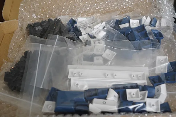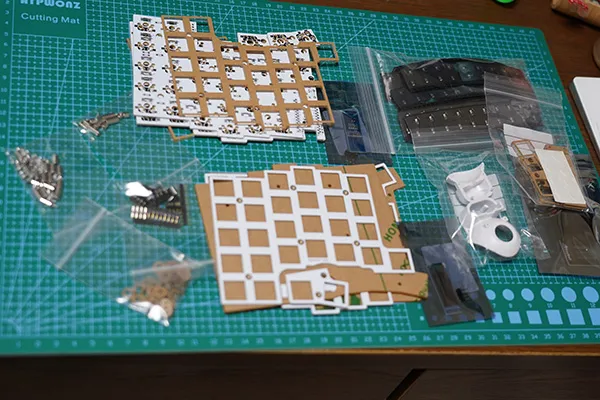 Keyball の組み立てキットにはたくさんのパーツが含まれています。これらの他にも色々必要なので、組み立てに必要なものは組み立てガイドで予習して、予め用意しておくのがお勧めです。わたしは都度悩んでは通販で足りないもの注文して進んだので、組み立て終えるまでに 1 週間くらいかかりました。特にキースイッチとキーキャップが鬼門でした。選択肢があまりに多い。