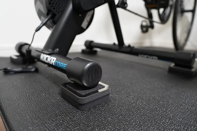 マットを敷いたり、Kicker Core にスプロケットを装着したらロードバイクをセッティングします。後ろのホイールを外し、ディスクブレーキの場合はローターを入れて、あとはホイールを装着するように取り付けます。