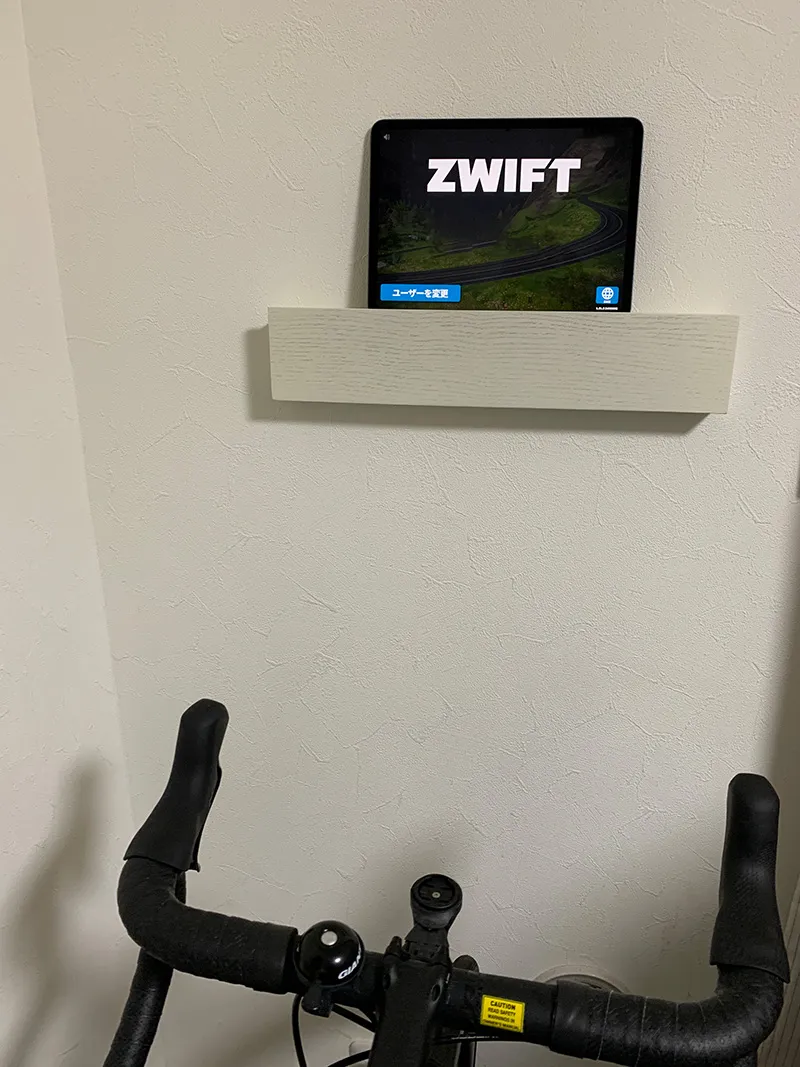 何もない壁に向かって漕ぎ続けるのはしんどいので、Zwift デビューもしました。元々はロードバイクの横に机があるのでそこに iPad 置きながら使っていました。ただ、使っているうちに首が辛いので前を向きたい。しかし、スペース的にロードバイクの前に机を置けないという問題がありました。それを解決してくれたのが無印。